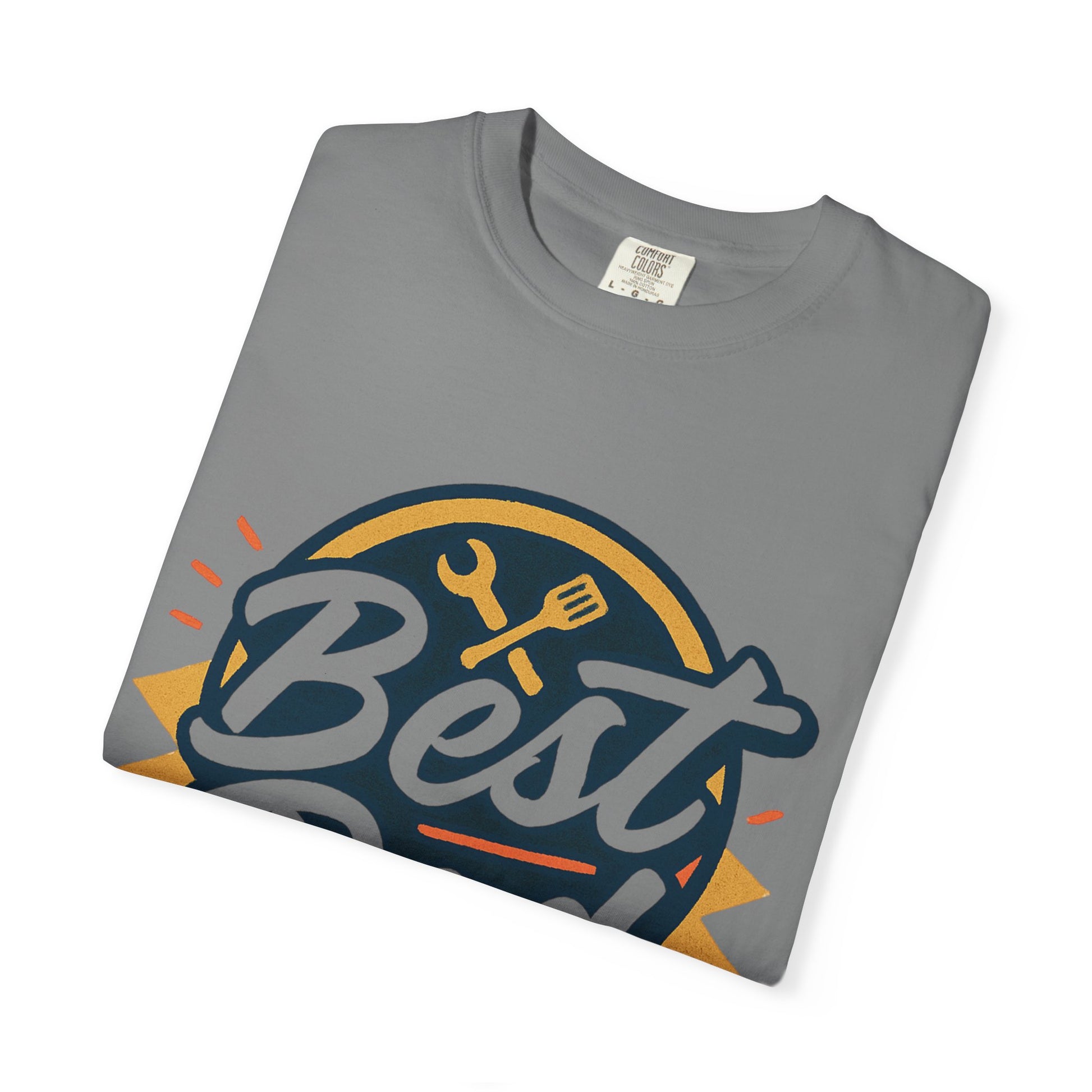 A relaxed, garment-dyed cotton tee that wears in softer with every wash. The bold “Best Dad Ever” badge—complete with tiny wrench and spatula icons—reads like a shout-out from the backyard grill or the weekend workshop. Lightweight but substantial midweight cotton gives it structure while the garment-dye process creates a lived-in color and texture that feels personal, not manufactured. Slip it on for Sunday morning projects, family cookouts, or a casual Father’s Day hangout; it sits comfortably over jeans or work shorts and ages into a favorite go-to. The look is straightforward and honest—celebratory without being loud—so the message comes through every time he wears it.
