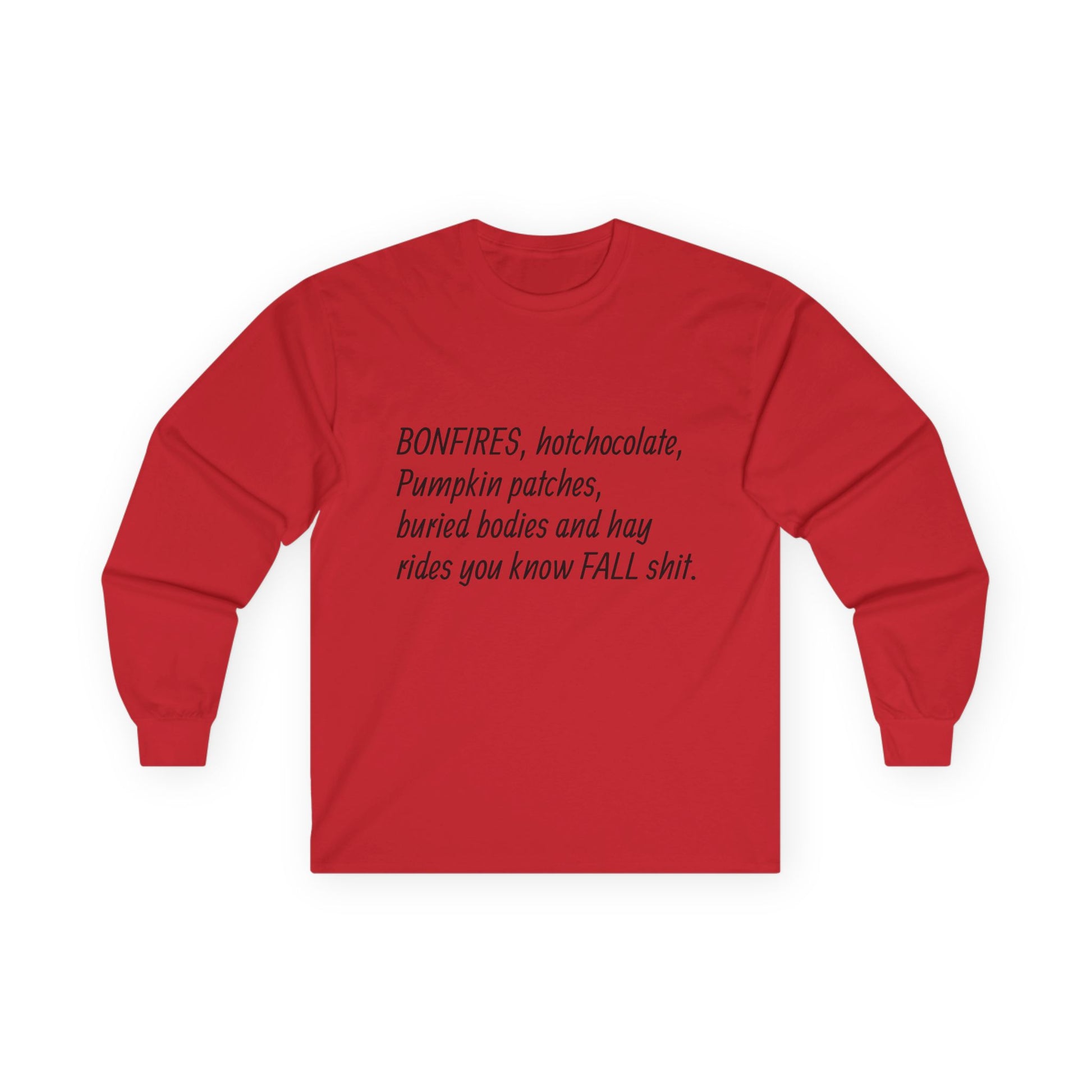 A funny fall-themed tee perfect for adding humor to your autumn wardrobe. This shirt gives off a playful and light-hearted vibe, making it a great addition to casual outfits during the fall season. It is relevant to adults looking for a unique and entertaining piece to wear during fall festivities and gatherings.